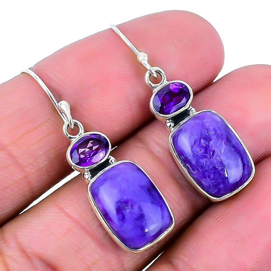 Russian Charoite Stone Engagement New Drop Earrings Jewelry 925 Sterling Silver