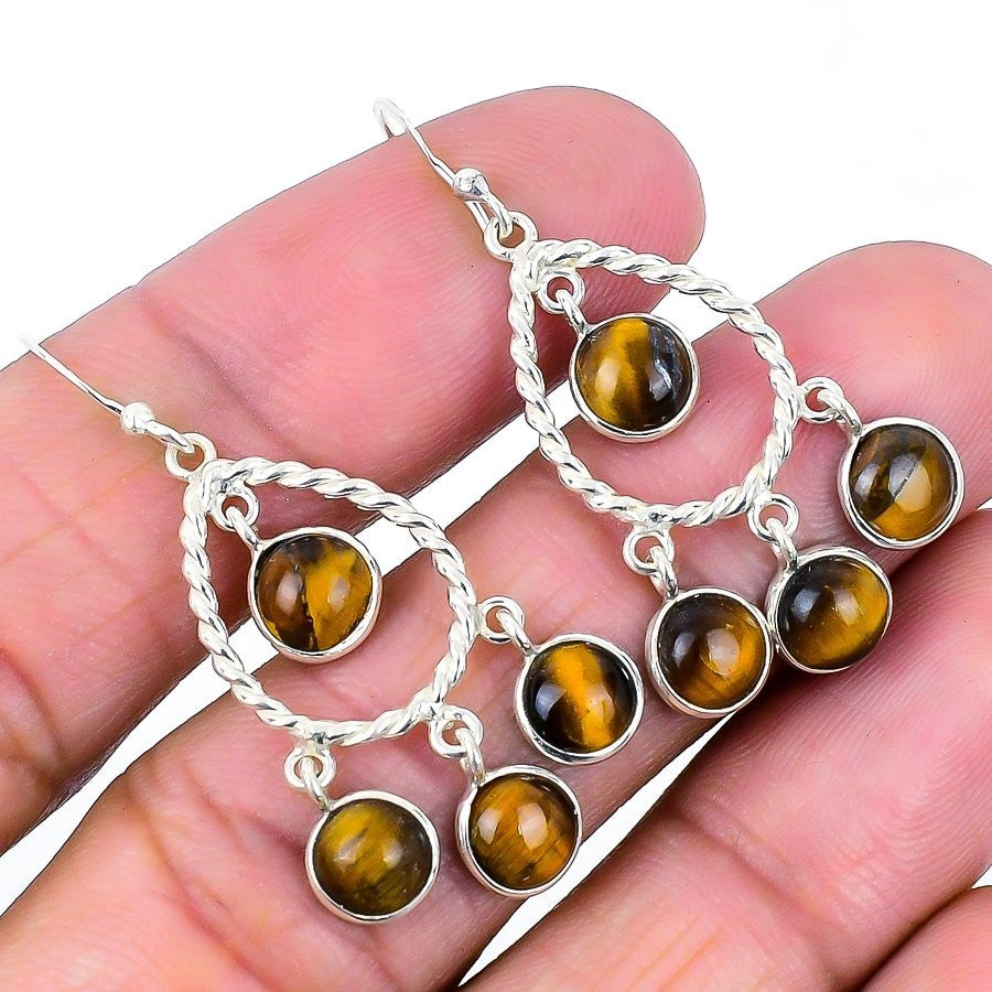 Sacral Chakra Tiger Eye Gemstone 925 Silver Wedding Hook Drop Earrings Jewelry