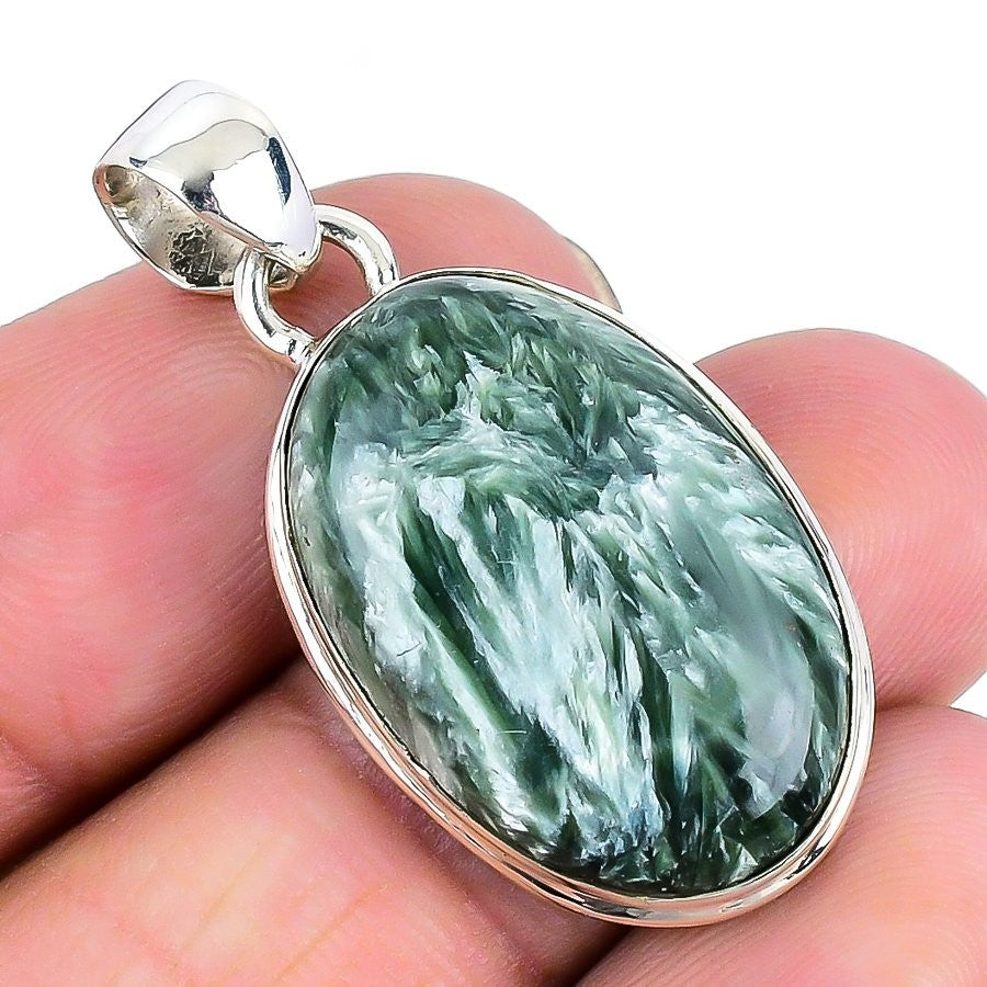 Seraphinite Gemstone Bezel Art Deco Unique Boho Pendant Jewelry 925 Solid Silver