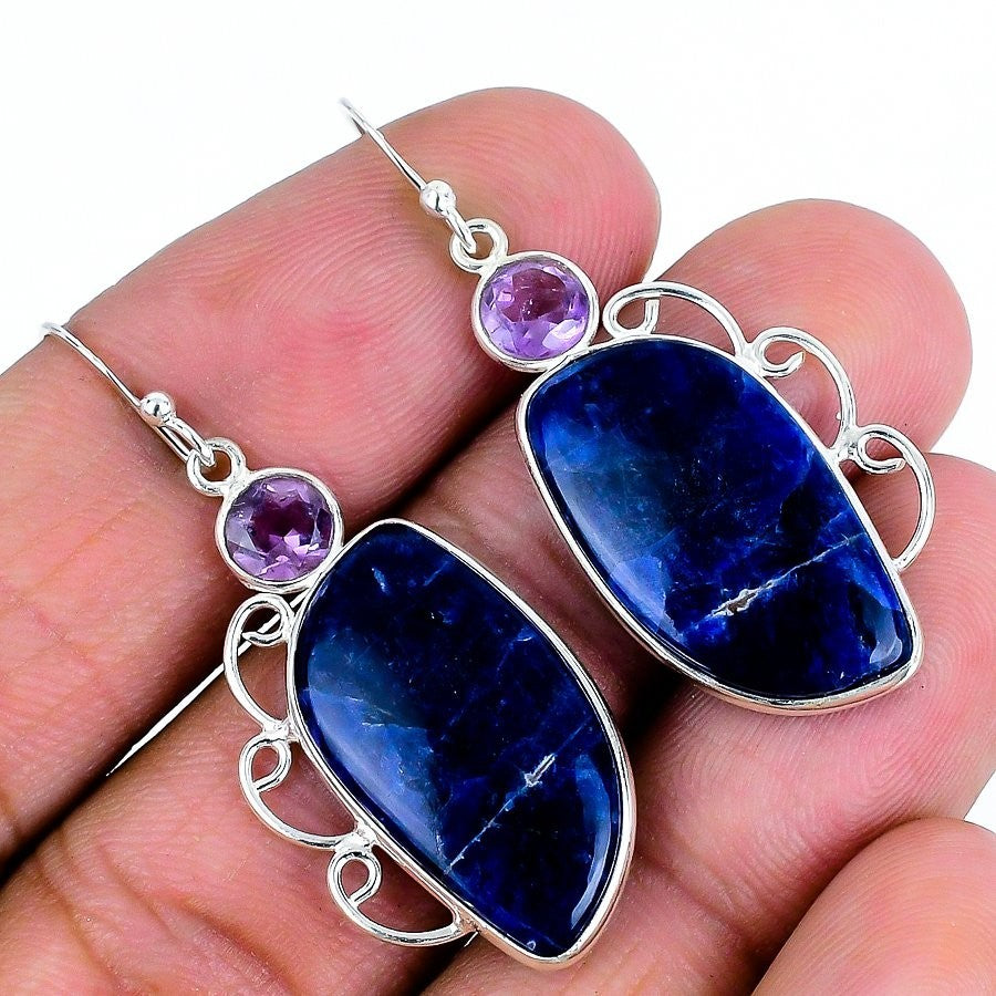Sodalite Stone 925 Sterling Silver Anniversary Dangling Bezel Earrings Jewelry