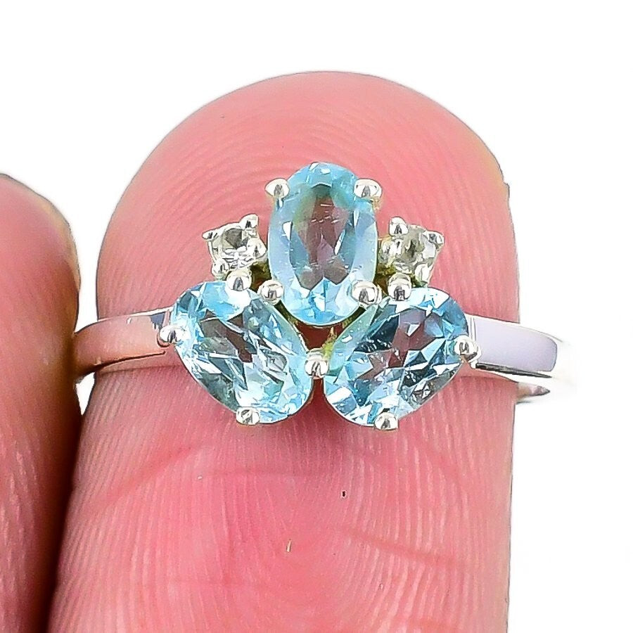 Swiss Blue Topaz Gemstone Sterling Silver Elegant Cluster Ring Jewelry Size 7