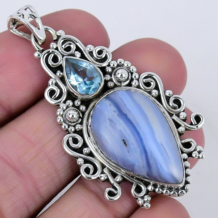 Third Eye Chakra Blue Lace Agate Stone 925 Silver Anniversary Pendant Jewelry