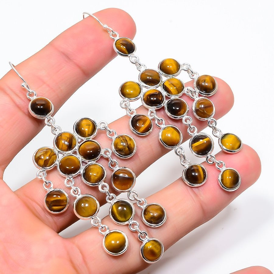 Tiger Eye Gemstone Solid Sterling Silver Dangle Drop Hook Boho Earrings Jewelry