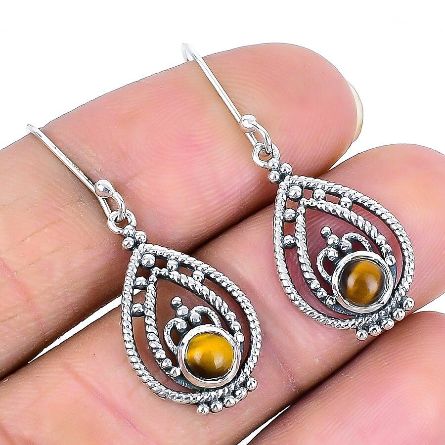 Tiger Eye Stone 925 Solid Silver Wife Dangle Sacral Chakra Handcrafted Earrings
