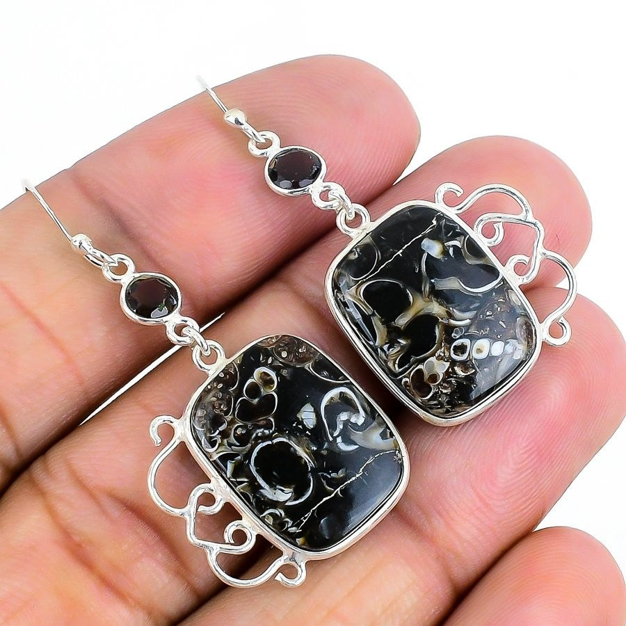 Turtilla Fossil Stone Solid Silver Elegant Boho Dangling Unique Earrings Jewelry