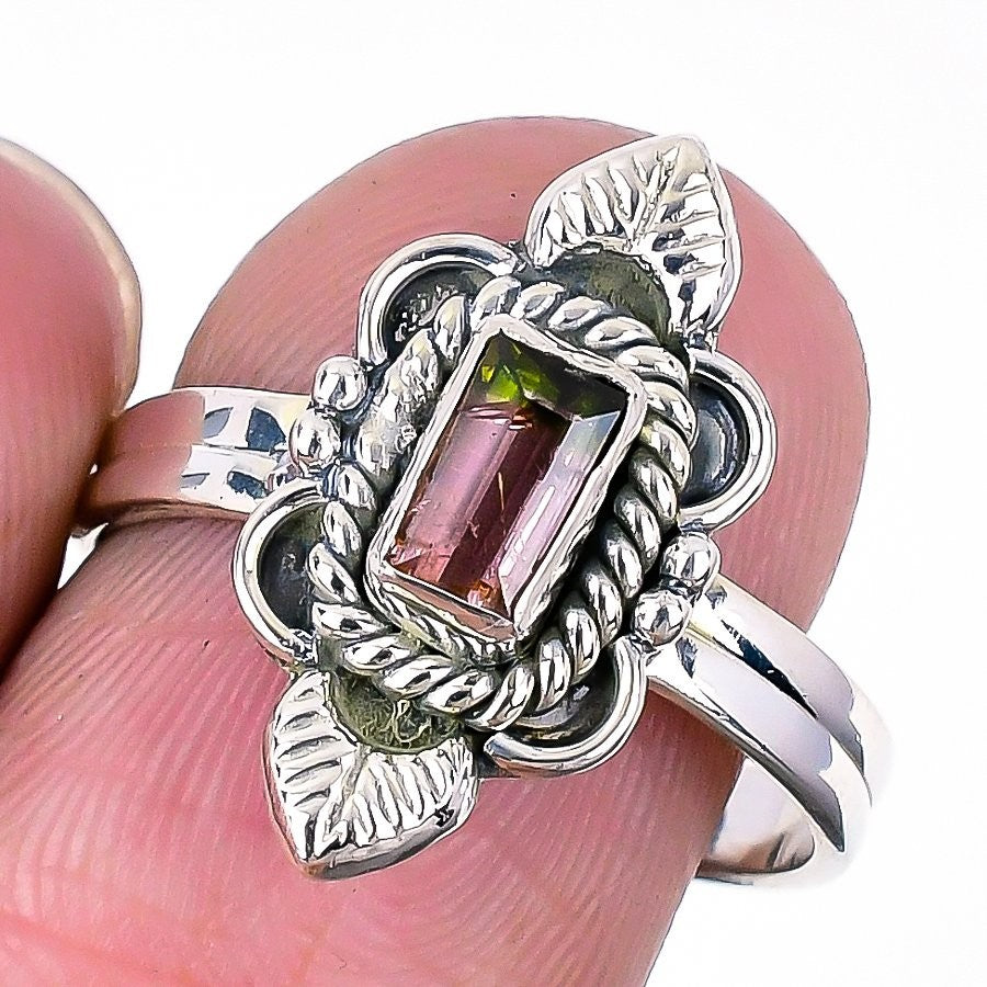 Watermelon Tourmaline Faceted Gemstone Solid Sterling Silver Ring Jewelry US 8.5
