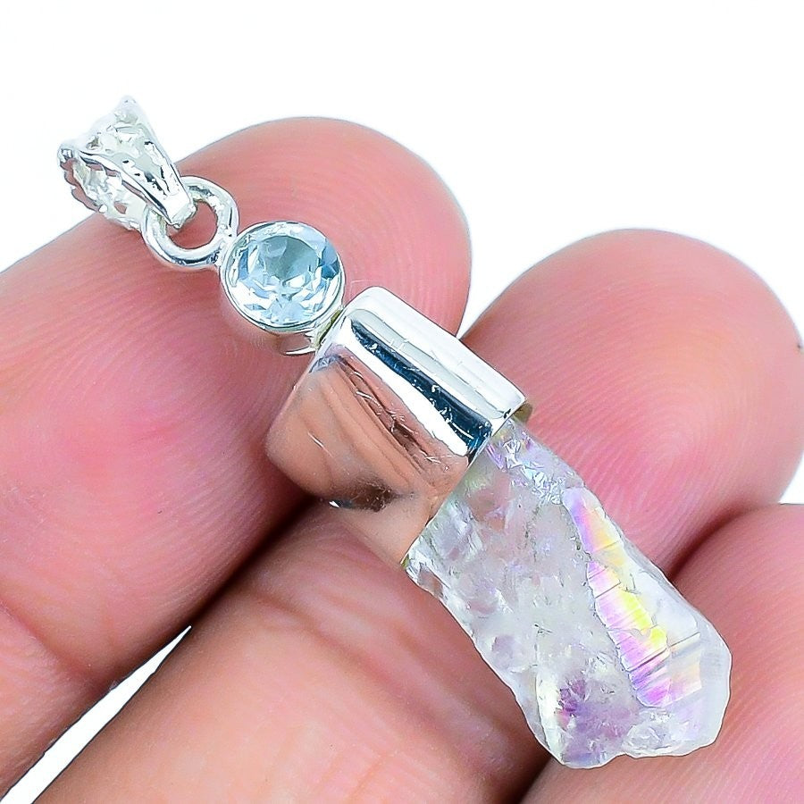 White Aura Crystal Gemstone Artisan Bezel Boho Wife Elegant Pendant 925 Silver
