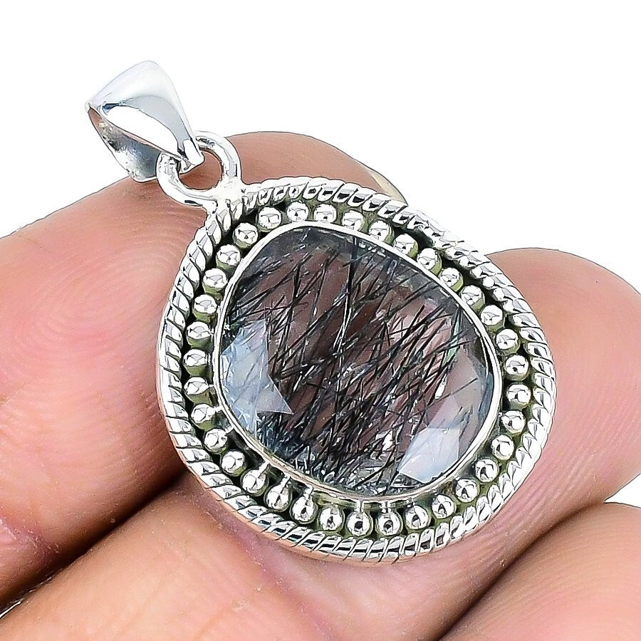 Black Rutile Stone Solid Silver Mother Unique Trendy Art Deco Wedding Pendant