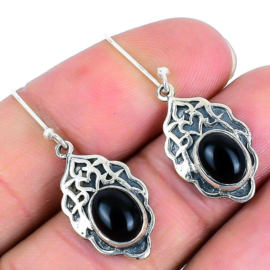 Black Onyx Gemstone Artisan Dangle Daughter Bezel Earrings Jewelry Solid Silver