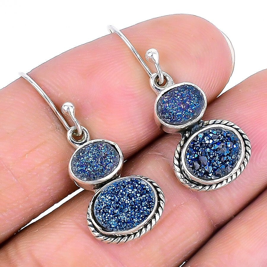 Titanium Druzy Gemstone Solid Sterling Silver Hook Dangle Drop Earrings Jewelry