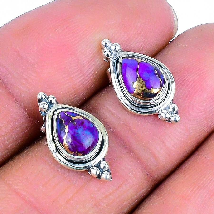 Copper Purple Turquoise Stone Stud Post Anniversary Earrings 925Ā SolidĀ Silver