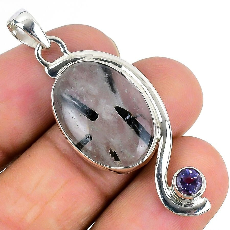 Black Rutile Stone Solid Sterling Silver Engagement Bezel Wife Elegant Pendant