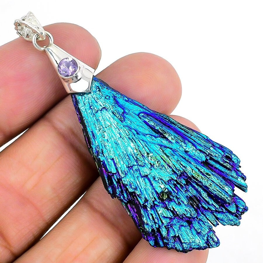 Peacock Titanium Kyanite Gemstone Boho Bezel Wedding Pendant Jewelry 925 Silver