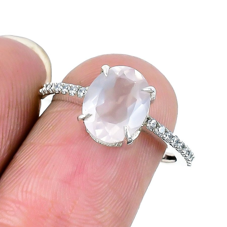 Rose Quartz Faceted Stone Engagement Wife Statement Ring Jewelry 925 Silver US 8