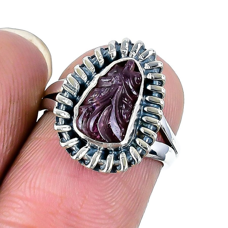 Pink Tourmaline Carving Gemstone Solid Silver Mother Boho Statement Ring Size 6