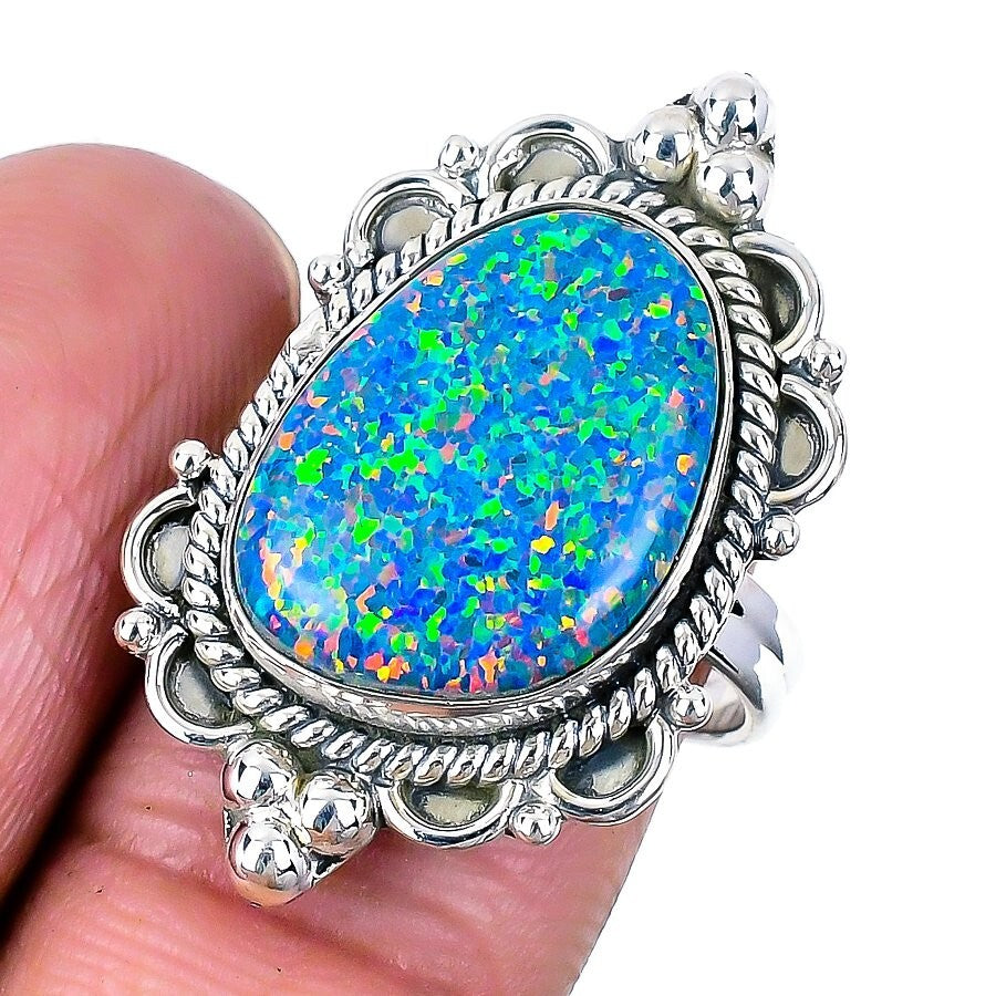 Aurora Opal Gemstone 925 Sterling Silver Statement Handmade Wedding Ring US 7.5
