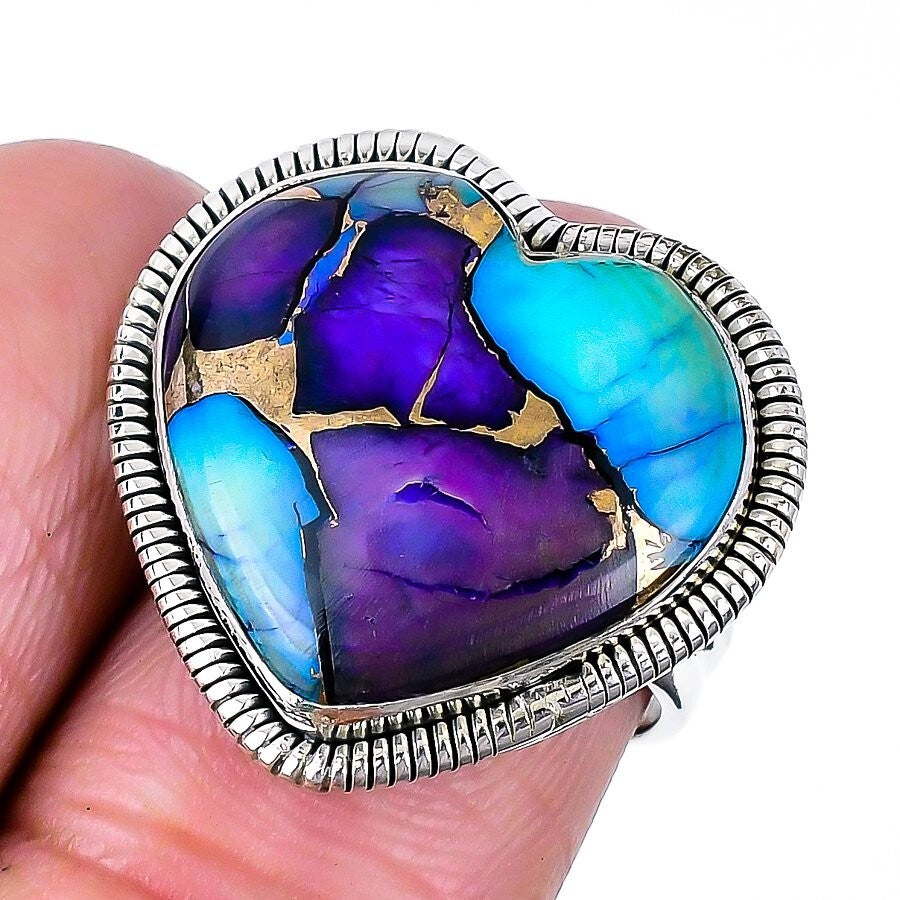 Purple Dahilia Turquoise Heart Gemstone Solid Sterling Silver Boho Ring Jewelry