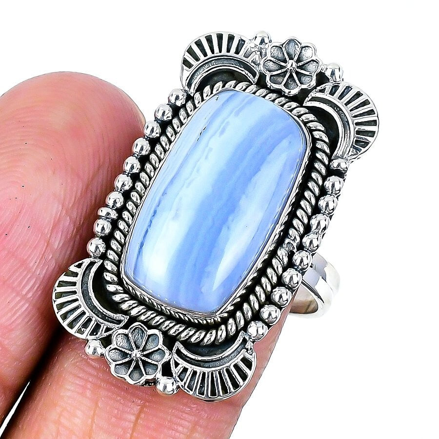 Blue Lace Agate Stone Solid Silver New Statement Handcrafted Ring Jewelry US 9