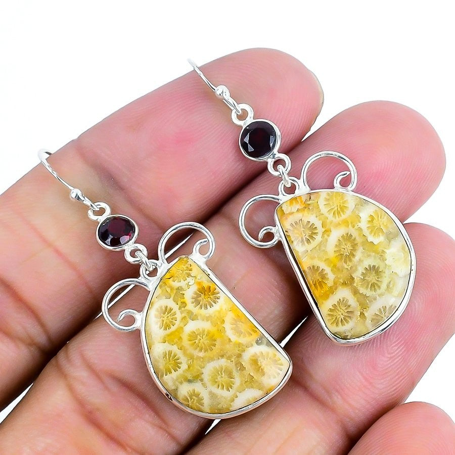Natural Fossil Coral Solid Silver Sister Unique Boho Drop Bezel Hook Earrings