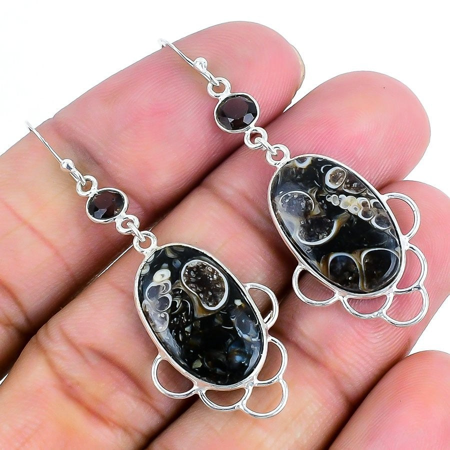 Turtilla Fossil Stone Solid Sterling Silver Hook Drop Dangle Engagement Earrings