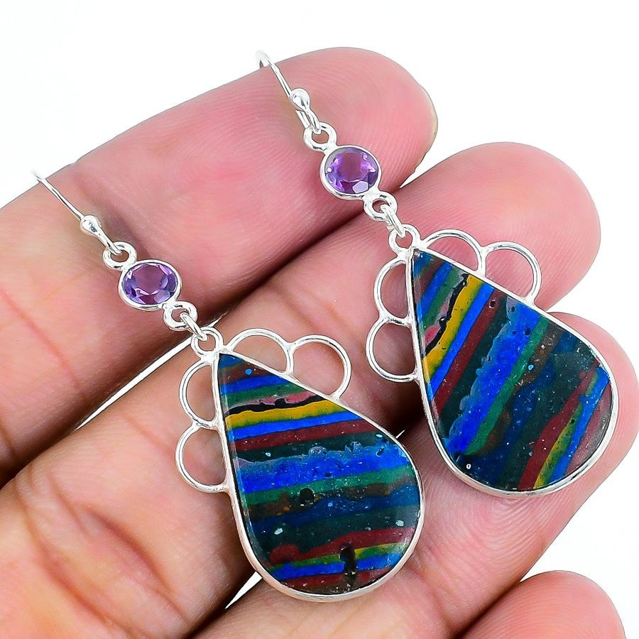 Rainbow Calsilica Gemstone 925 Solid Silver Boho Dangle Drop Earrings Jewelry