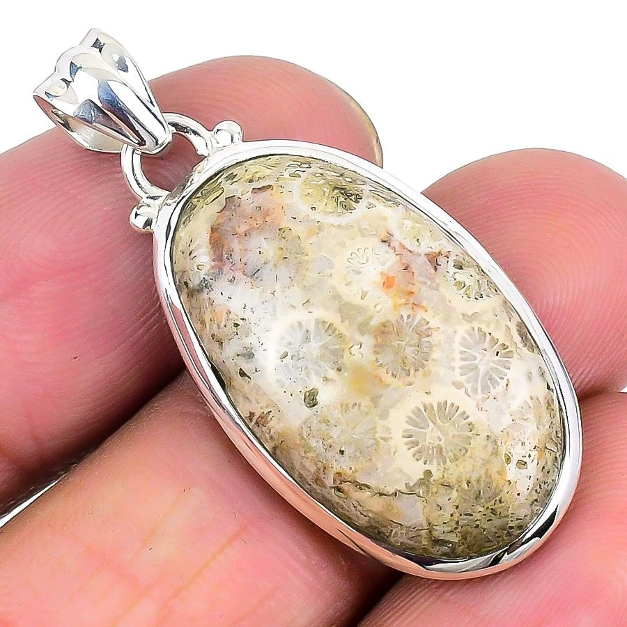 Fossil Coral Stone Channel Set Mother Sisters Gift Pendant Jewelry Solid Silver