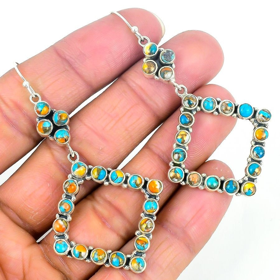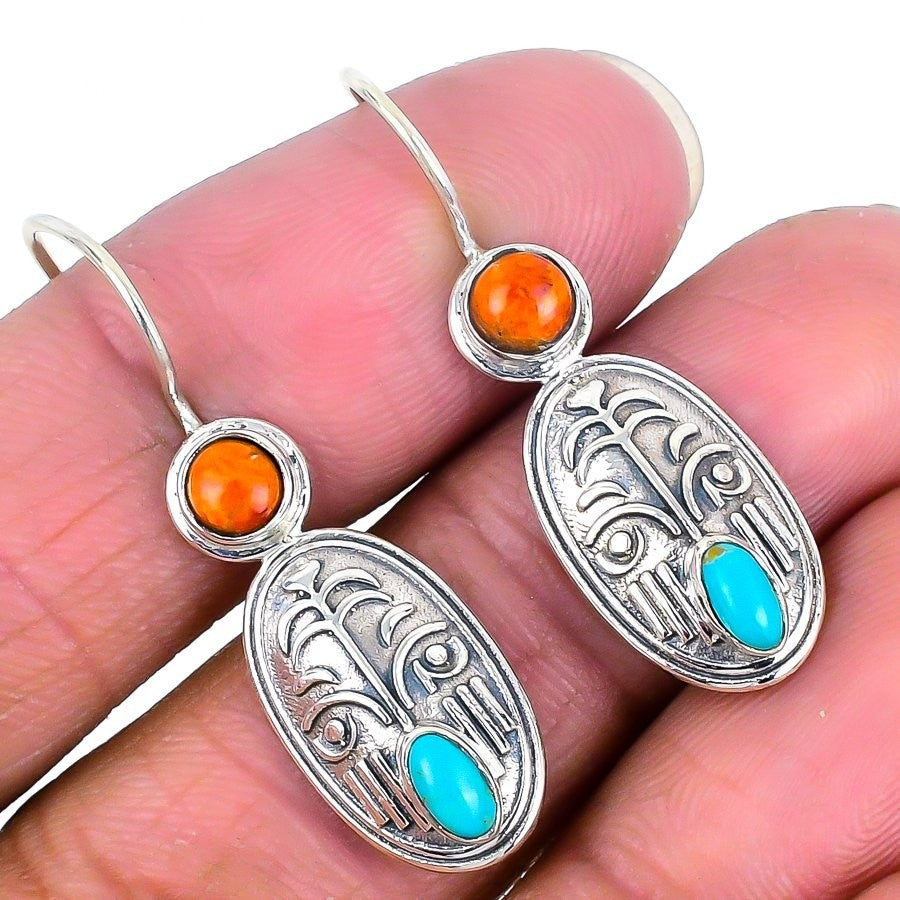 Natural Orange Oyster Shell Turquoise Sterling Silver Wife Dangle Drop Earrings