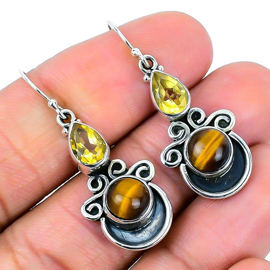 Natural Tiger Eye 925 Silver Dangle Drop Sacral Chakra Handmade Earrings Jewelry