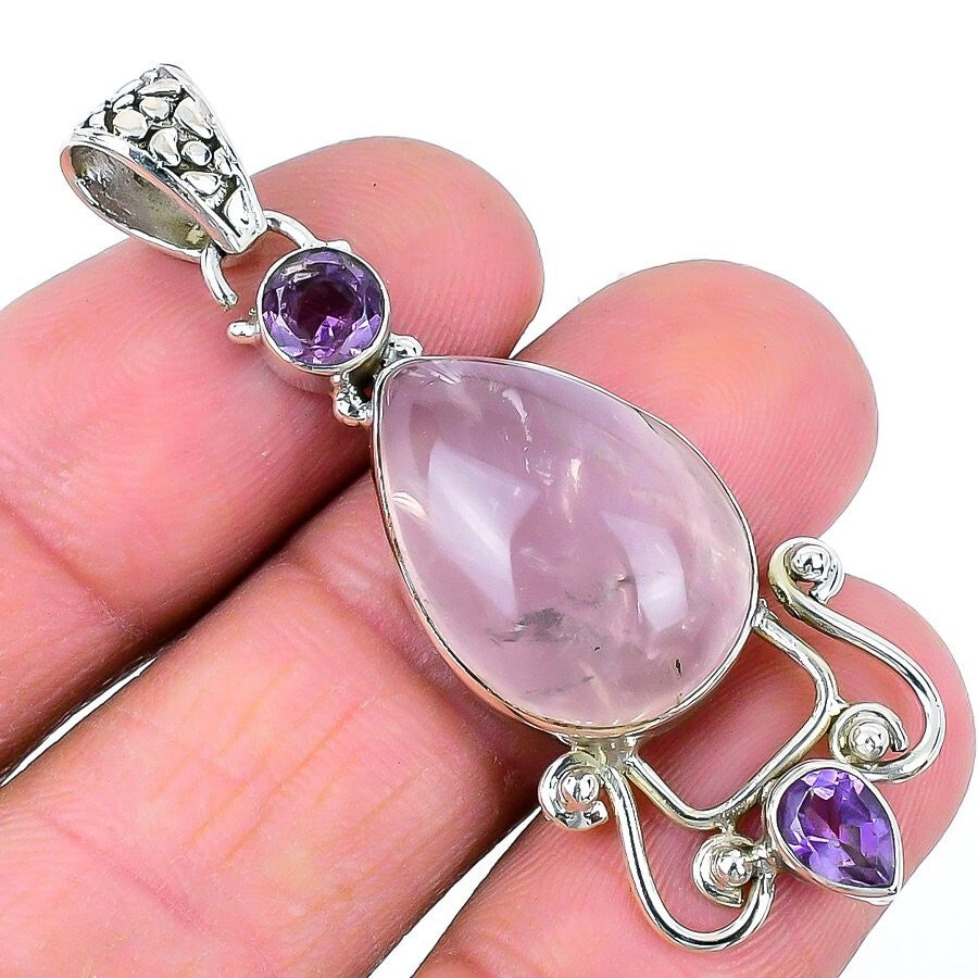 Heart Chakra Natural Rose Quartz Handcrafted Boho Pendant Solid Sterling Silver