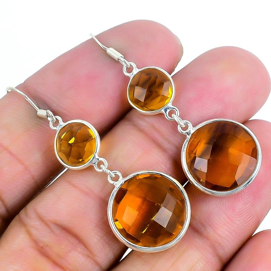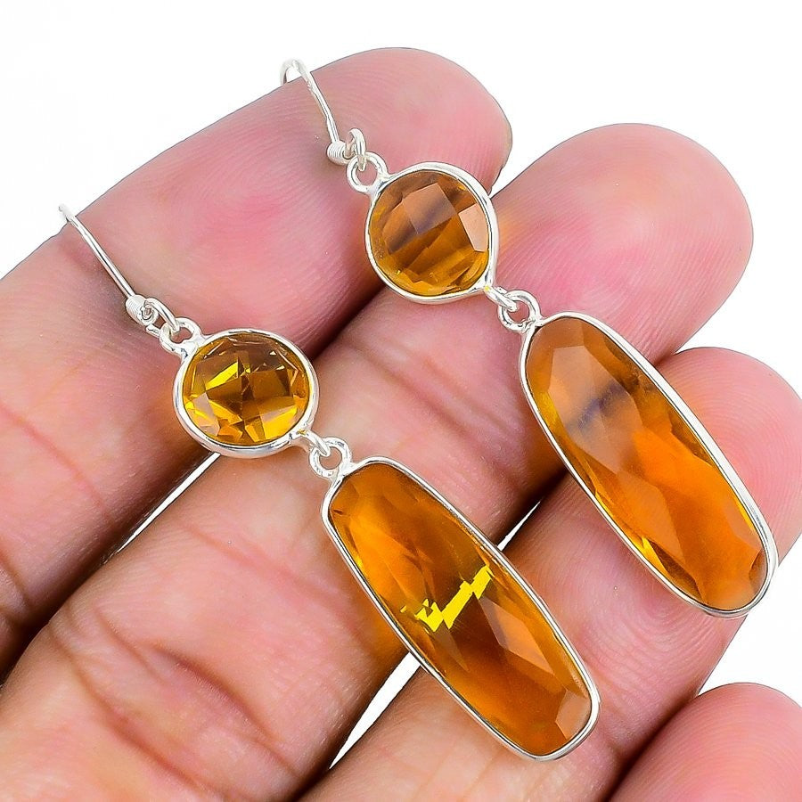 Citrine Treated Gemstone 925 Sterling Silver Boho Dangling Bezel Unique Earrings