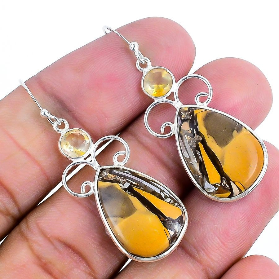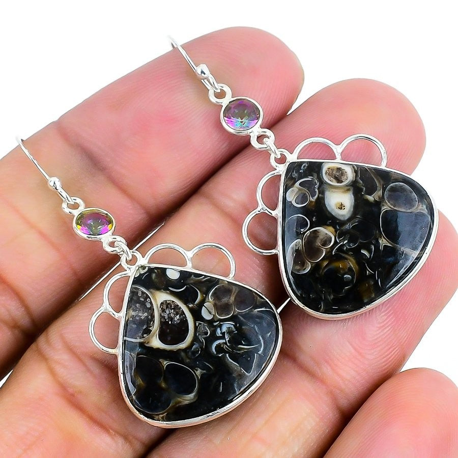 Turtilla Fossil Gemstone Solid Silver Handmade Wife Dangle Drop Earrings Jewelry