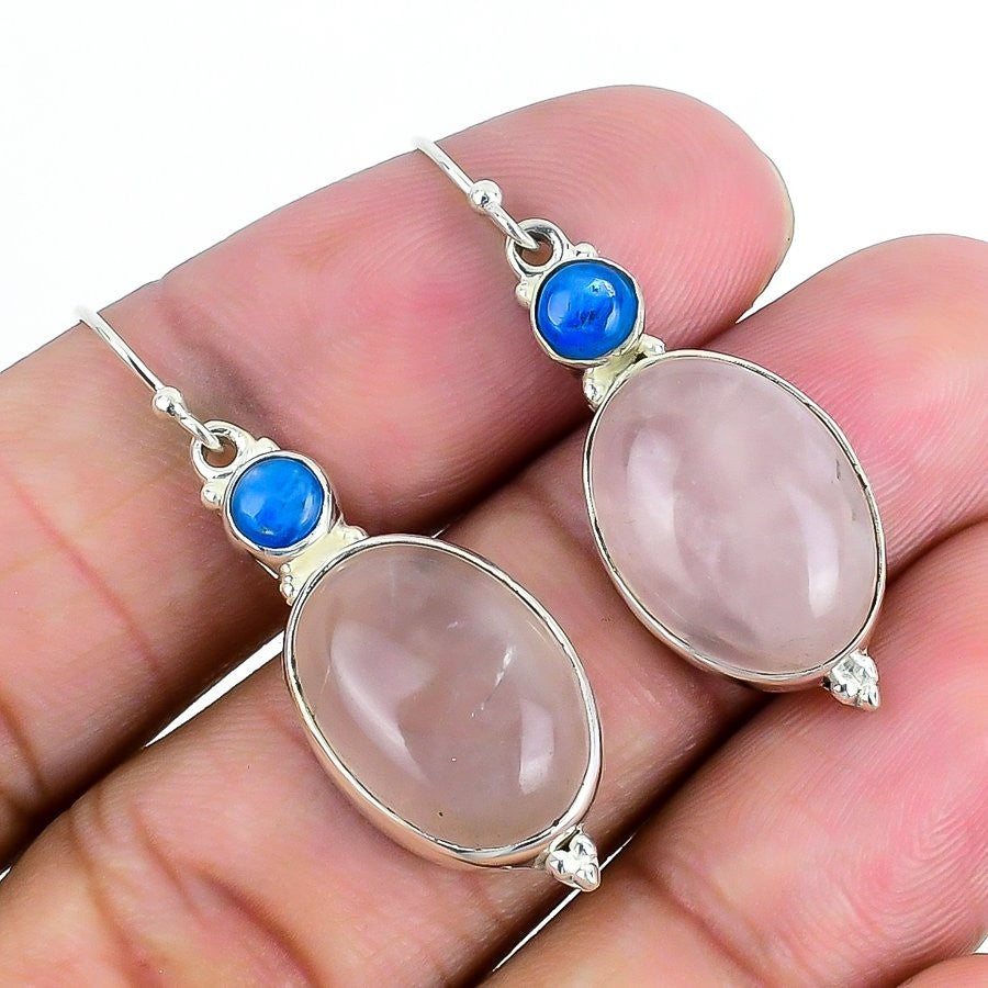 Rose Quartz Stone 925 Sterling Silver Trendy Drop Dangle Bezel Daughter Earrings
