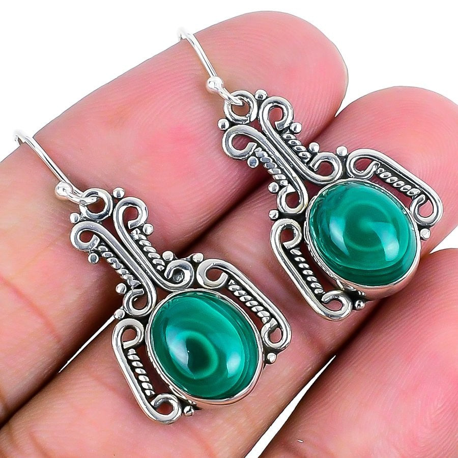 Heart Chakra Natural Malachite Solid Sterling Silver Dangling Wedding Earrings