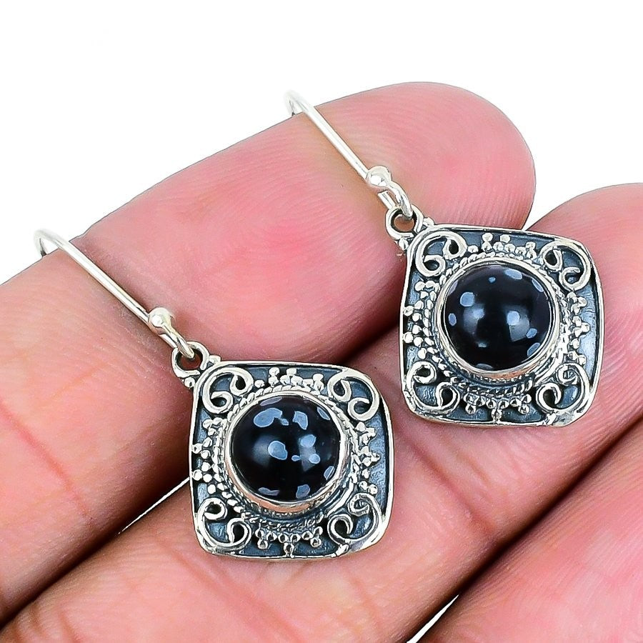 Snowflake Obsidian Gemstone Solid Silver Artisan Dangling Hook Earrings Jewelry
