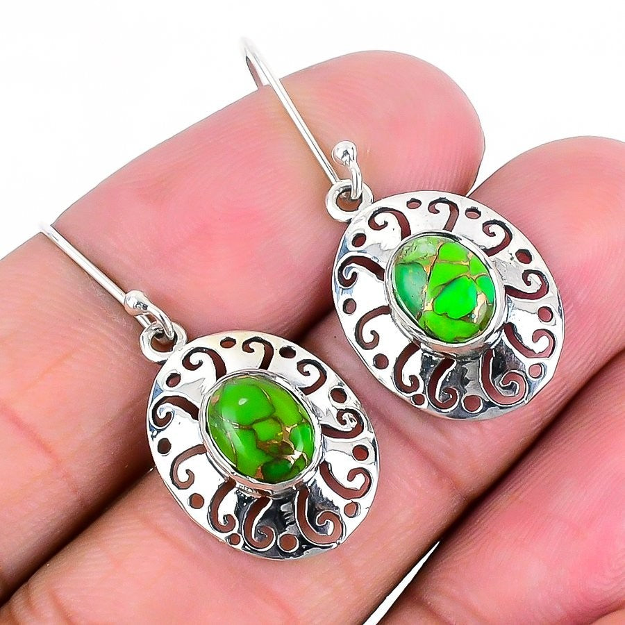 Green Copper Turquoise Stone Solid Sterling Silver Dangle Sisters Gift Earrings