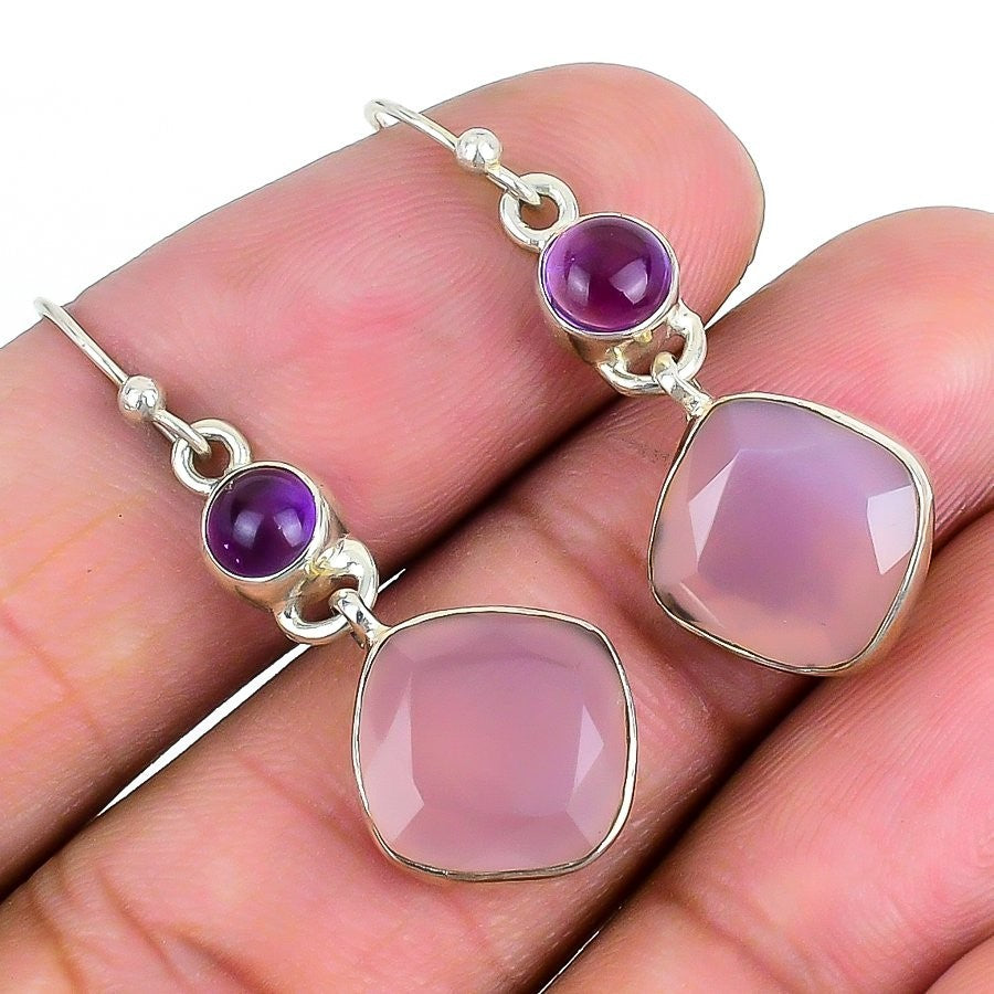 Natural Rose Quartz Solid Silver Dangle Channel Set Handmade Earrings Jewelry