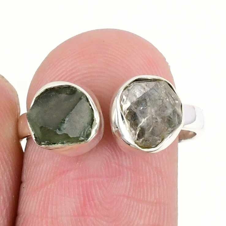 Moldavite & herkimer Diamond Stone Cluster Ring Jewelry Size 8 925Ā SolidĀ Silver
