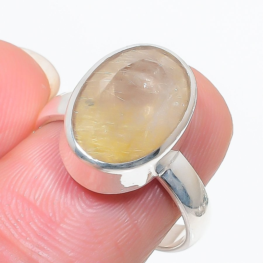 Natural Golden Rutile Trendy Statement Ring Jewelry 925 Sterling Silver US 10