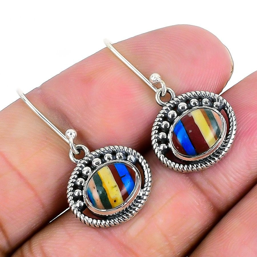 Rainbow Calsilica Gemstone Sterling Silver Dangle Mother Bezel Earrings Jewelry