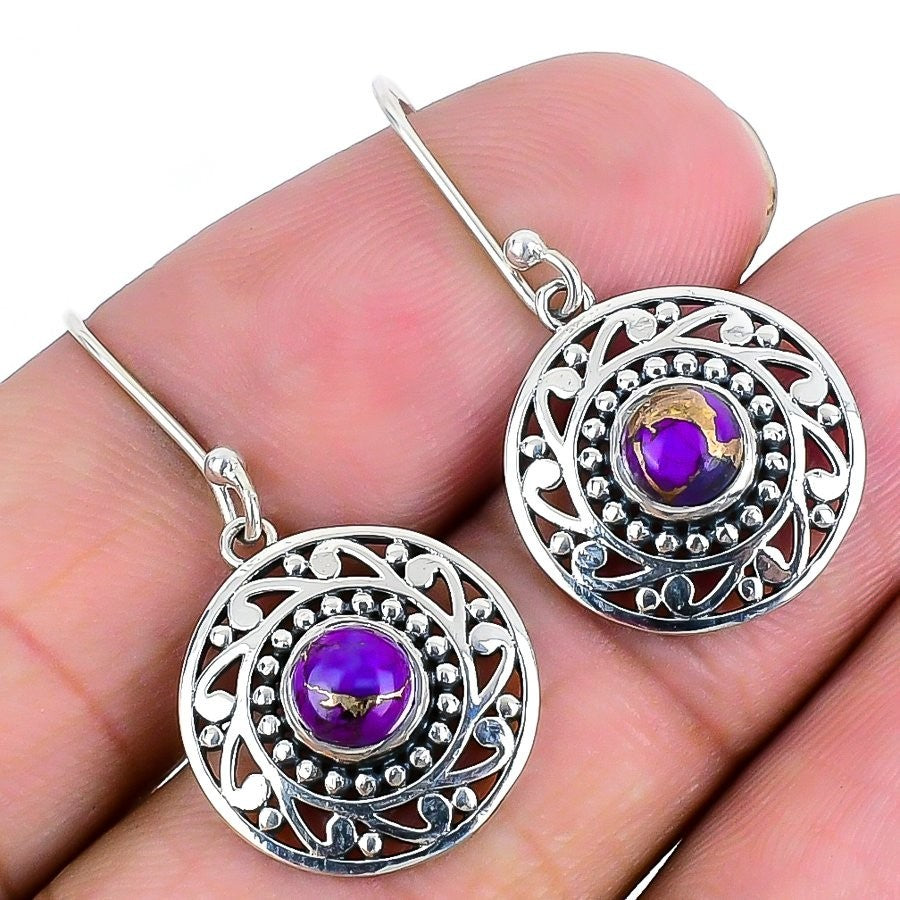 Copper Purple Turquoise Gemstone 925 Sterling Silver Hook Dangling Boho Earrings