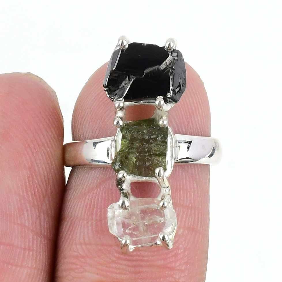 Root Chakra Moldavite Shungite Stone Cluster Ring Jewelry Size 6 Solid Silver