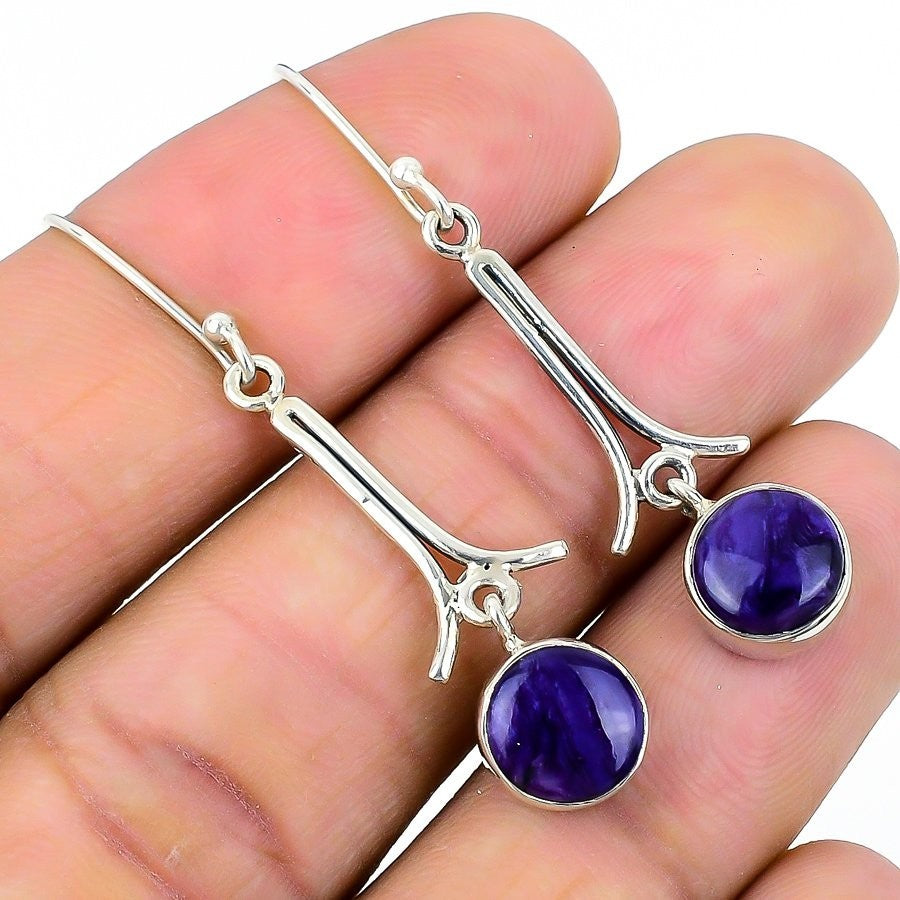 Russian Charoite Stone Mother Art Deco Drop Dangle Wedding Earrings Solid Silver