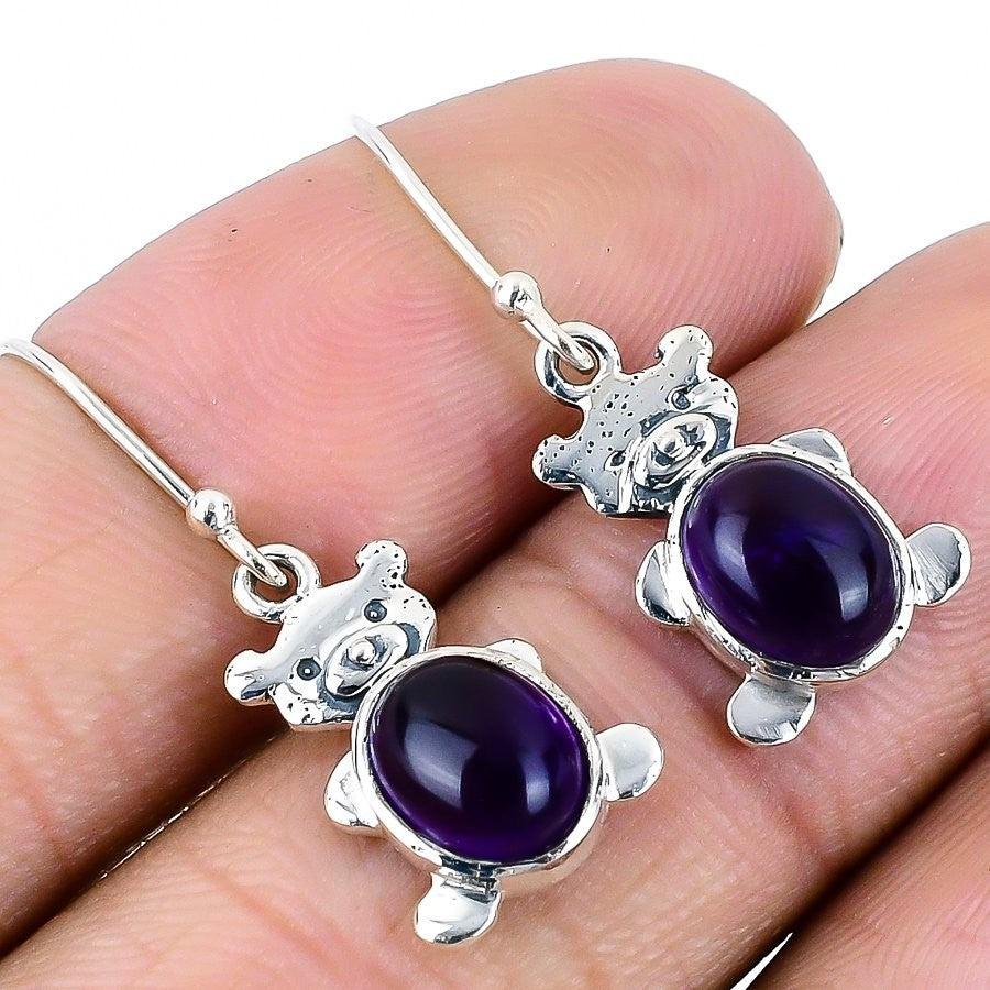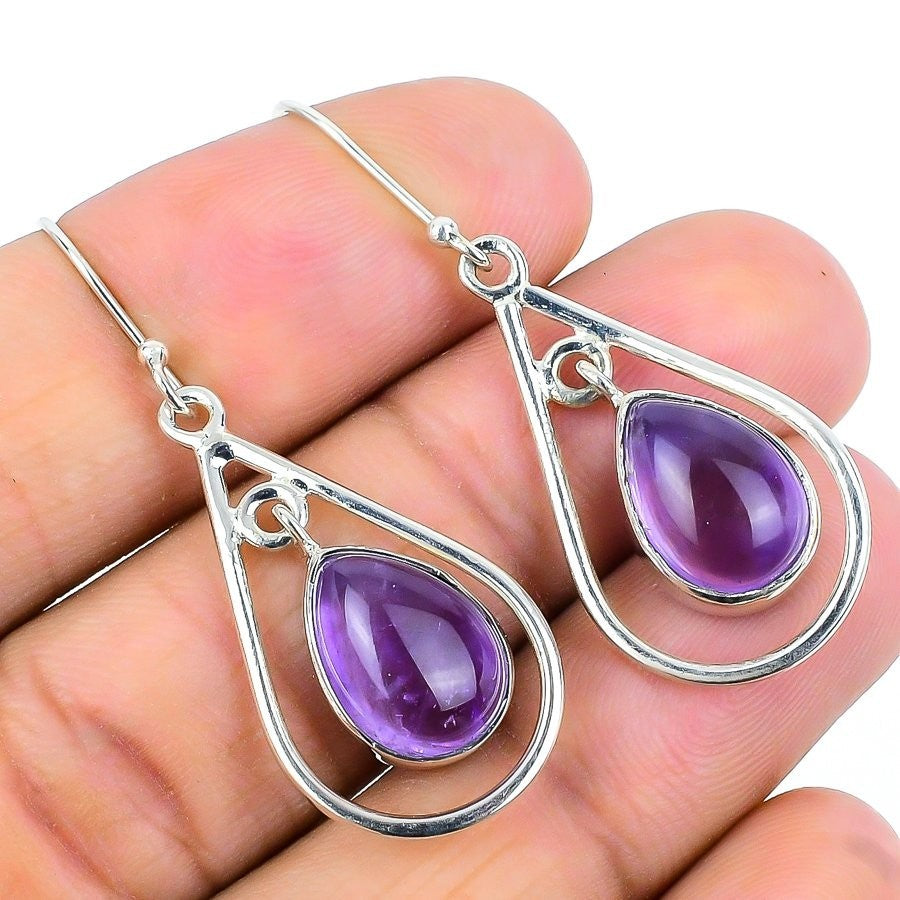 Crown Chakra Natural Sage Amethyst Hook Dangling Earrings 925 Sterling Silver