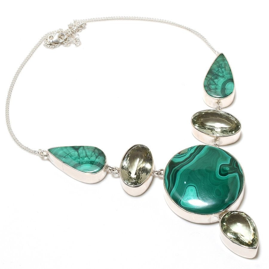Malachite Gemstone Daughter Chain Art Deco Wedding Necklace Jewelry Solid Silver