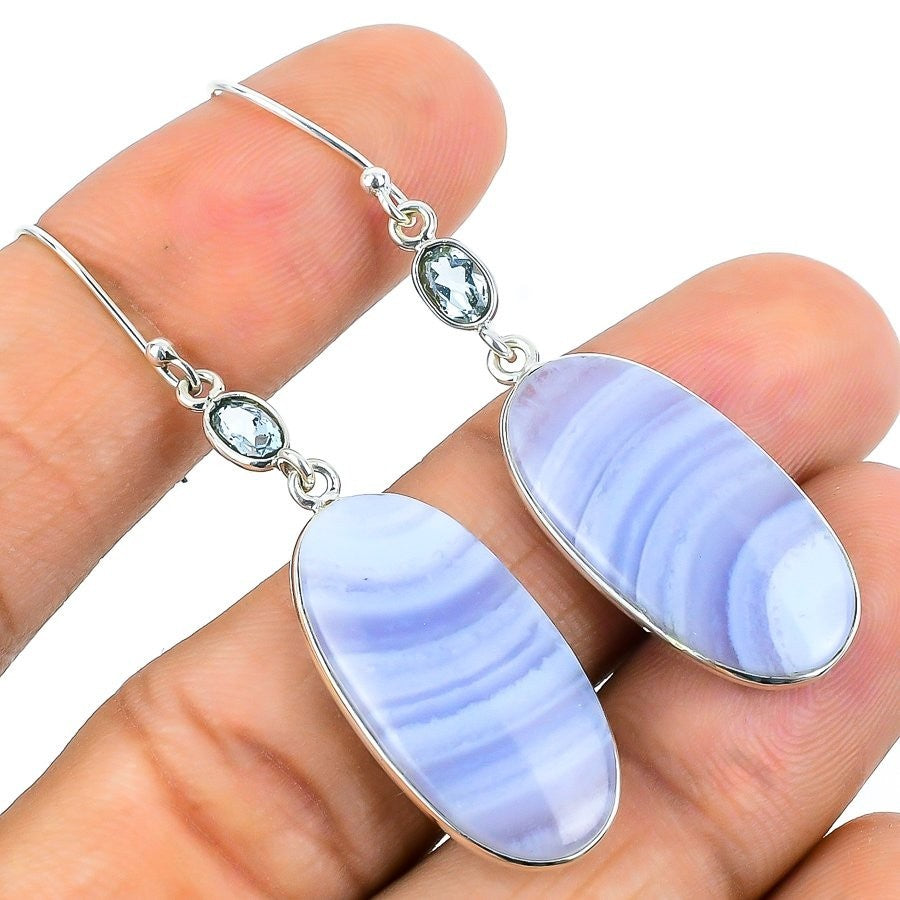 Natural Blue Lace Agate Friendship Day Dangling Earrings Jewelry Solid Silver