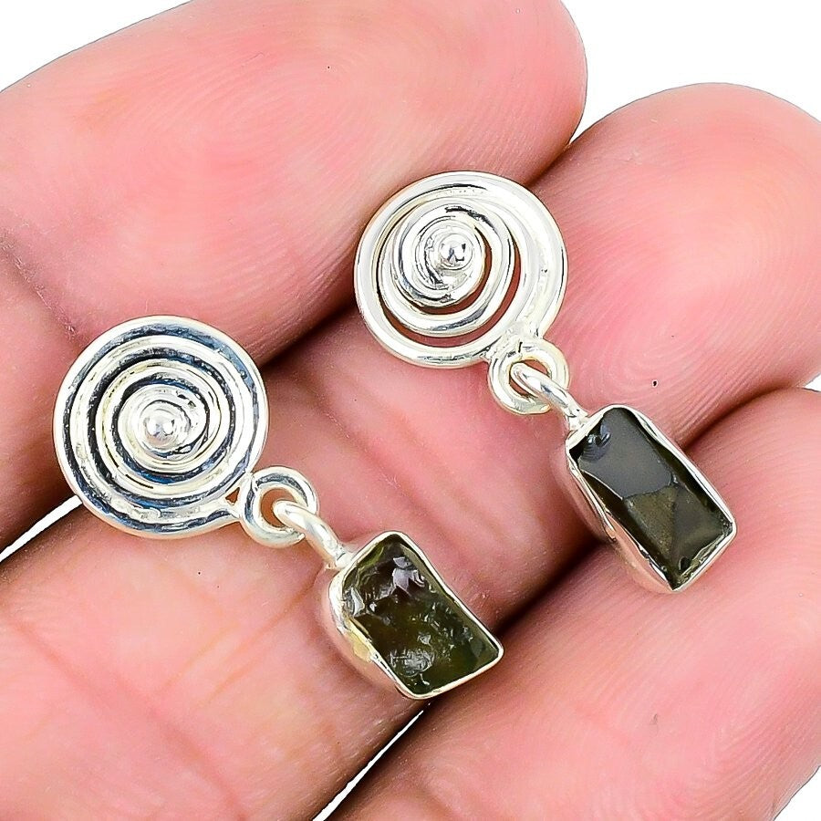 Moldavite Gemstone Solid Silver Birthday Dangle Drop Art Deco Earrings Jewelry