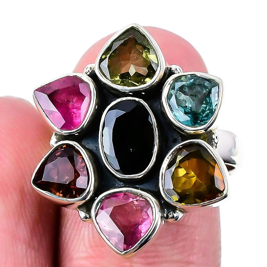 Multi Sapphire Gemstone Sterling Silver Statement Birthday Trendy Ring Size 8.5