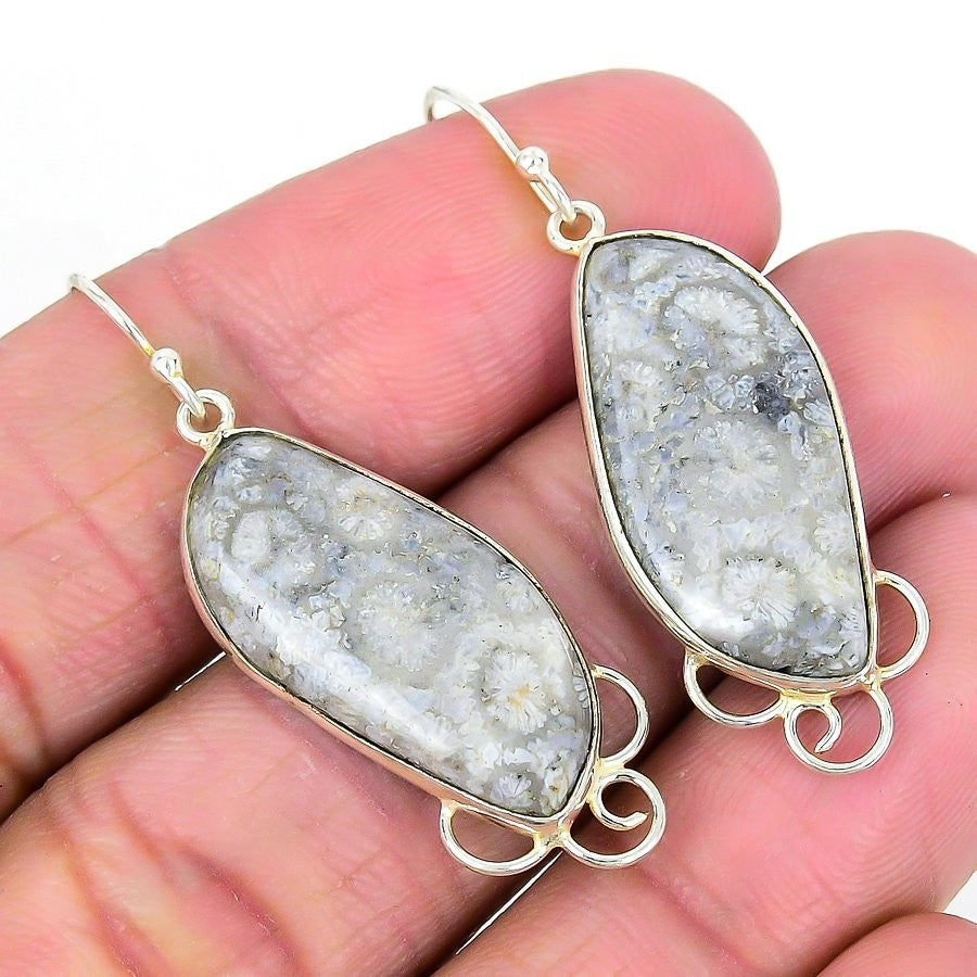 Friendship Day Sale Fossil"Coral Stone 925 Silver Elegant Drop Dangle Earrings