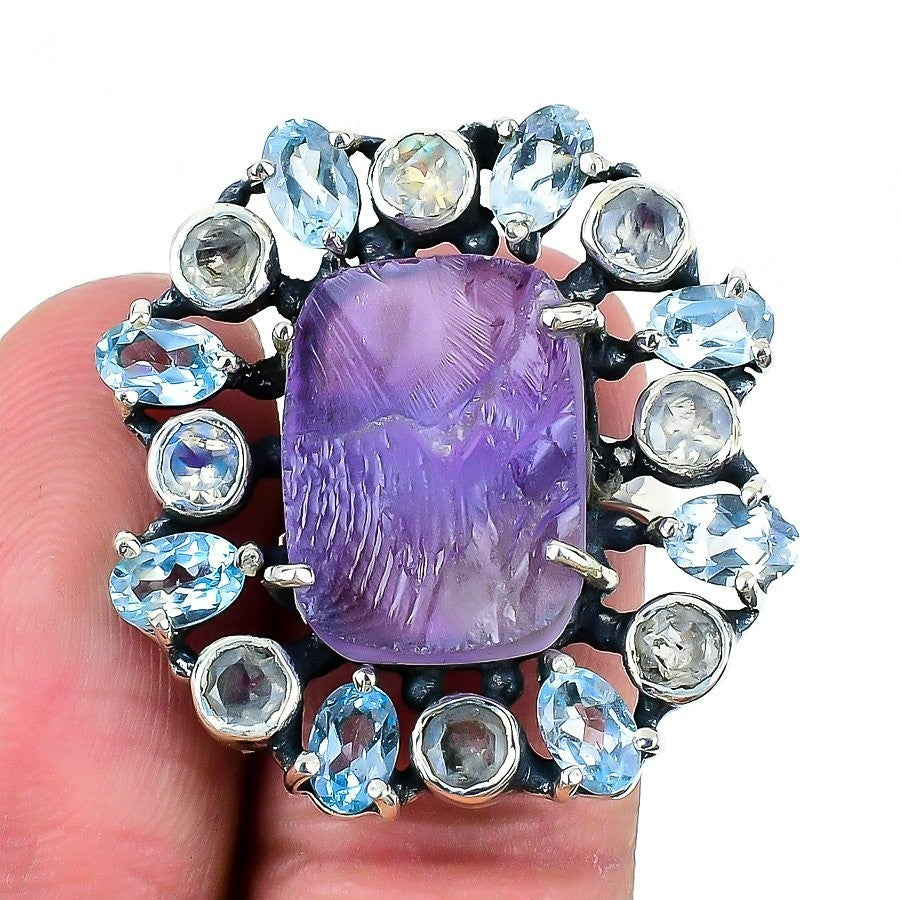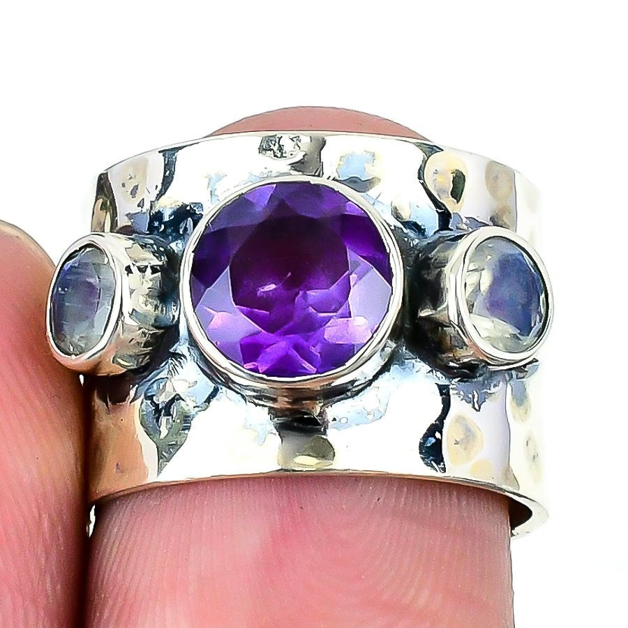 Amethyst Stone Handmade Boho Statement Mother Ring Solid Sterling Silver US 6.5