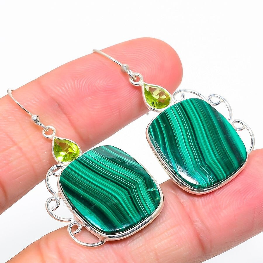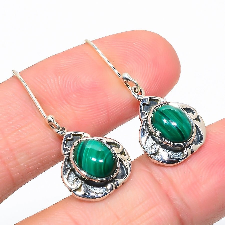Malachite Stone Solid Sterling Silver Dangle Drop Wife Handcrafted Hook Earrings
